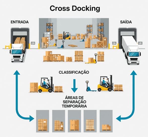cross-docking é uma estratégia de distribuição logística onde as mercadorias de um fornecedor são recebidas num centro de distribuição e, em vez de serem armazenadas, são imediatamente preparadas e enviadas para o seu destino final. O objetivo principal é eliminar ou reduzir ao máximo o tempo de armazenagem, fazendo com que os produtos “atravessem as docas” (daí o nome, “cross the docks”) num fluxo contínuo.